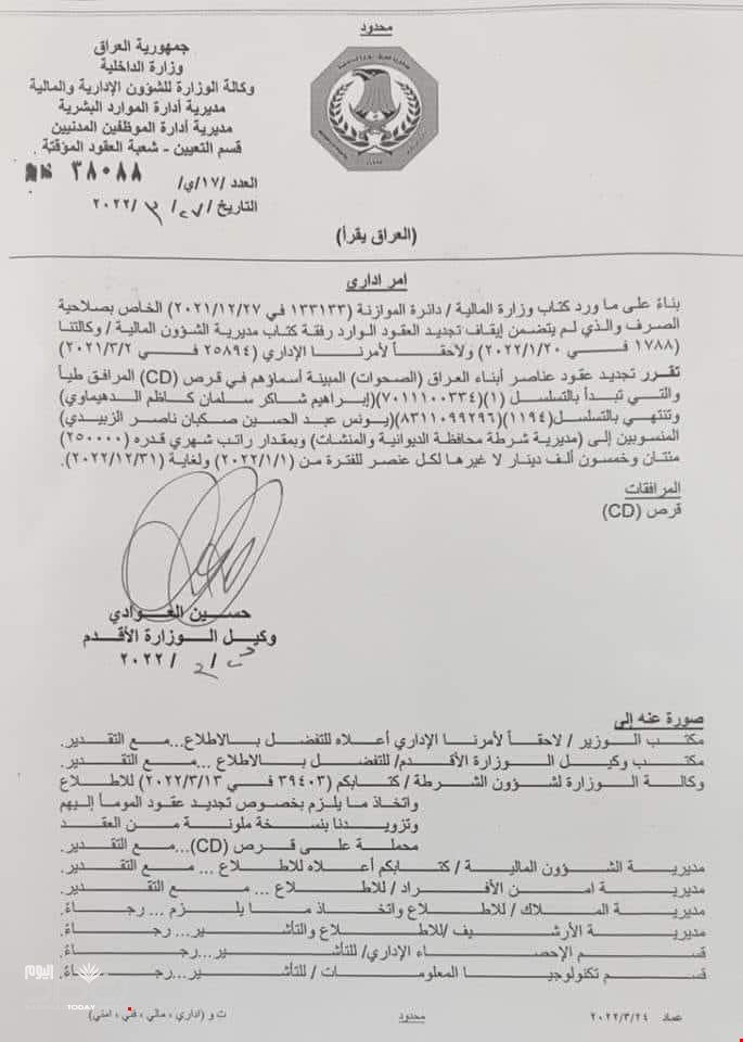 أصدرت وزارة الداخلية، اليوم الاحد، أمرا اداريا بتجديد التعاقد لمنتسبي الصحوات بعد تأخر صرف رواتبهم منذ بداية السنة الحالية.ادناه نص الأمر الاداري: