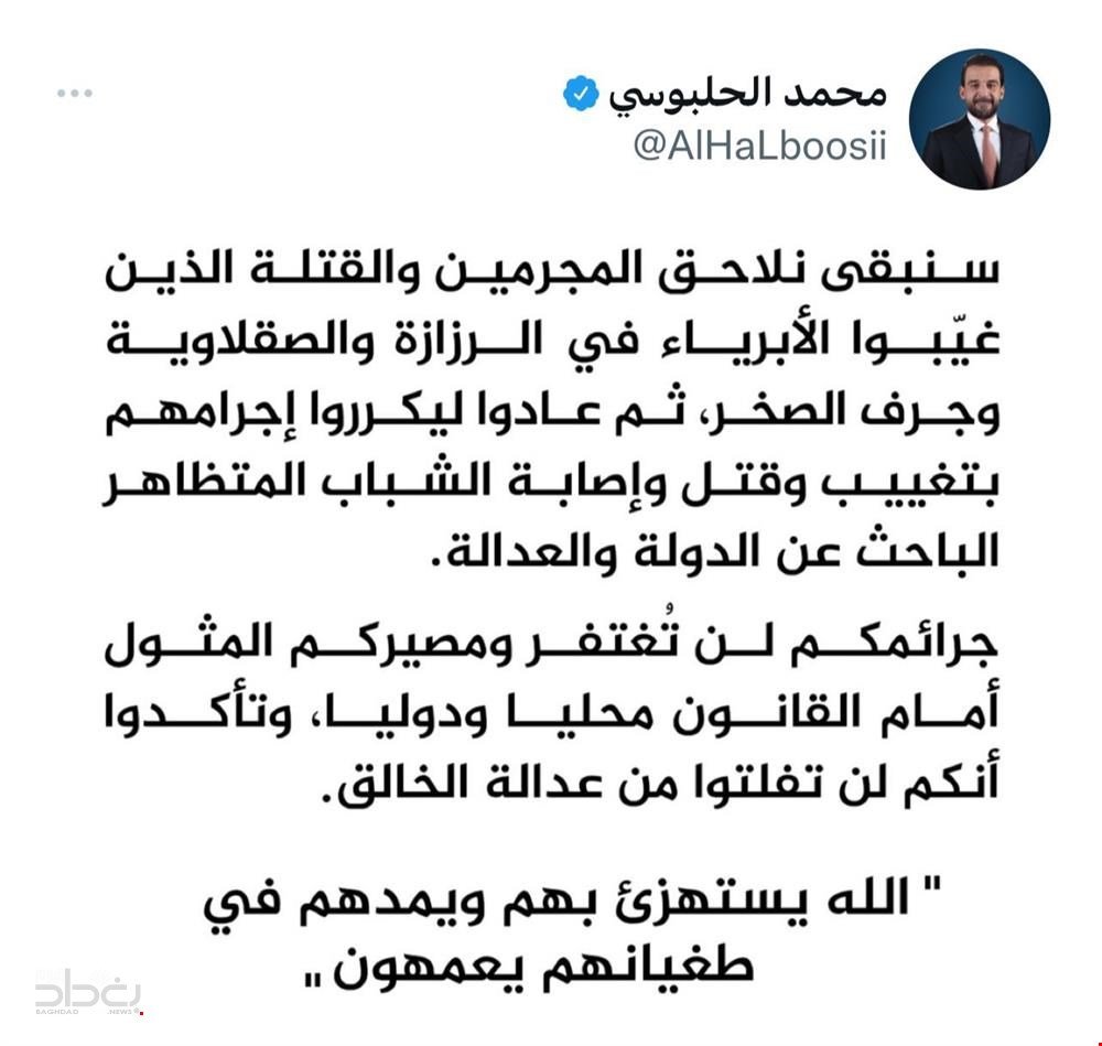 أكد رئيس مجلس النواب، محمد الحلبوسي، اليوم الجمعة، أنه سيبقى يلاحق المجرمين والقتلة الذين غيبوا الأبرياء، مؤكدا أن جرائمهم لن تغتفر. ادناه تغريدة الحلبوسي: