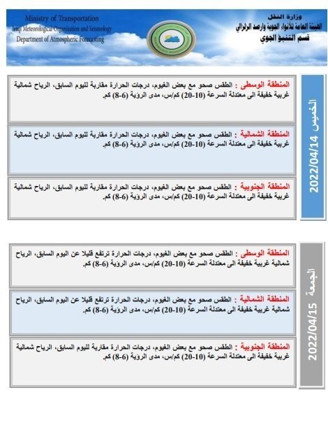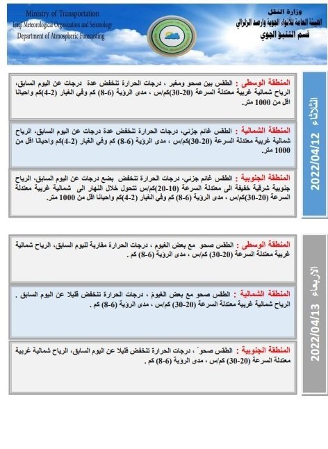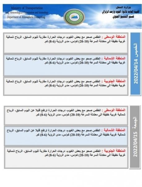 أعلنت هيئة الأنواء الجوية، اليوم الاثنين، عن حالة الطقس للأسبوع الحالي، فيما توقعت انخفاضاً في درجات الحرارة بدءاً من الغد.