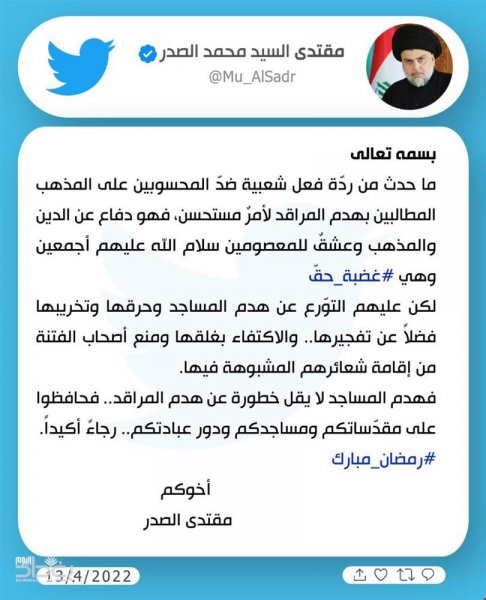 غرد زعيم التيار الصدري مقتدى الصدر، اليوم الأربعاء، بشأن هدم المساجد.وقال الصدر في "تغريدة" له "بتويتر" تابعها صحفي : "ماحدث من ردة فعل شعبية ضد المحسوبين على المذهب المطالبين بهدم المراقد فهو امر مستحسن".فيما يلي نص التغريدة: