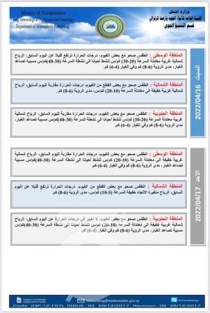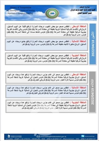 وفي ما يلي جداول الهيئة لحالة الطقس في عموم البلاد لليوم، والأيام الأربعة المقبلة: