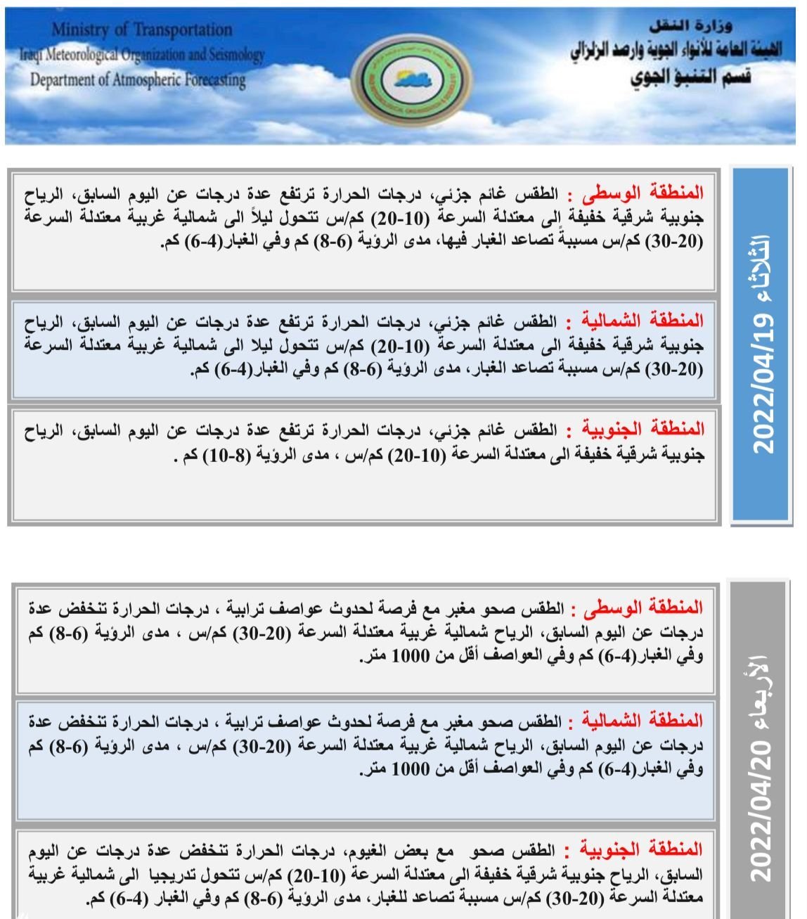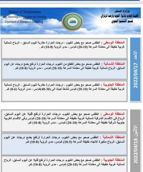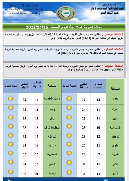 أعلنت هيئة الأنواء الجوية، اليوم السبت، عن حالة الطقس في البلاد للأيام المقبلة، فيما توقعت عواصف ترابية وانخفاض في درجات الحرارة منتصف الأسبوع.