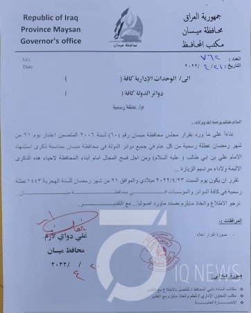 أعلن محافظ ميسان، علي دواي، تعطيل الدوام الرسمي في المحافظة يوم السبت المقبل.