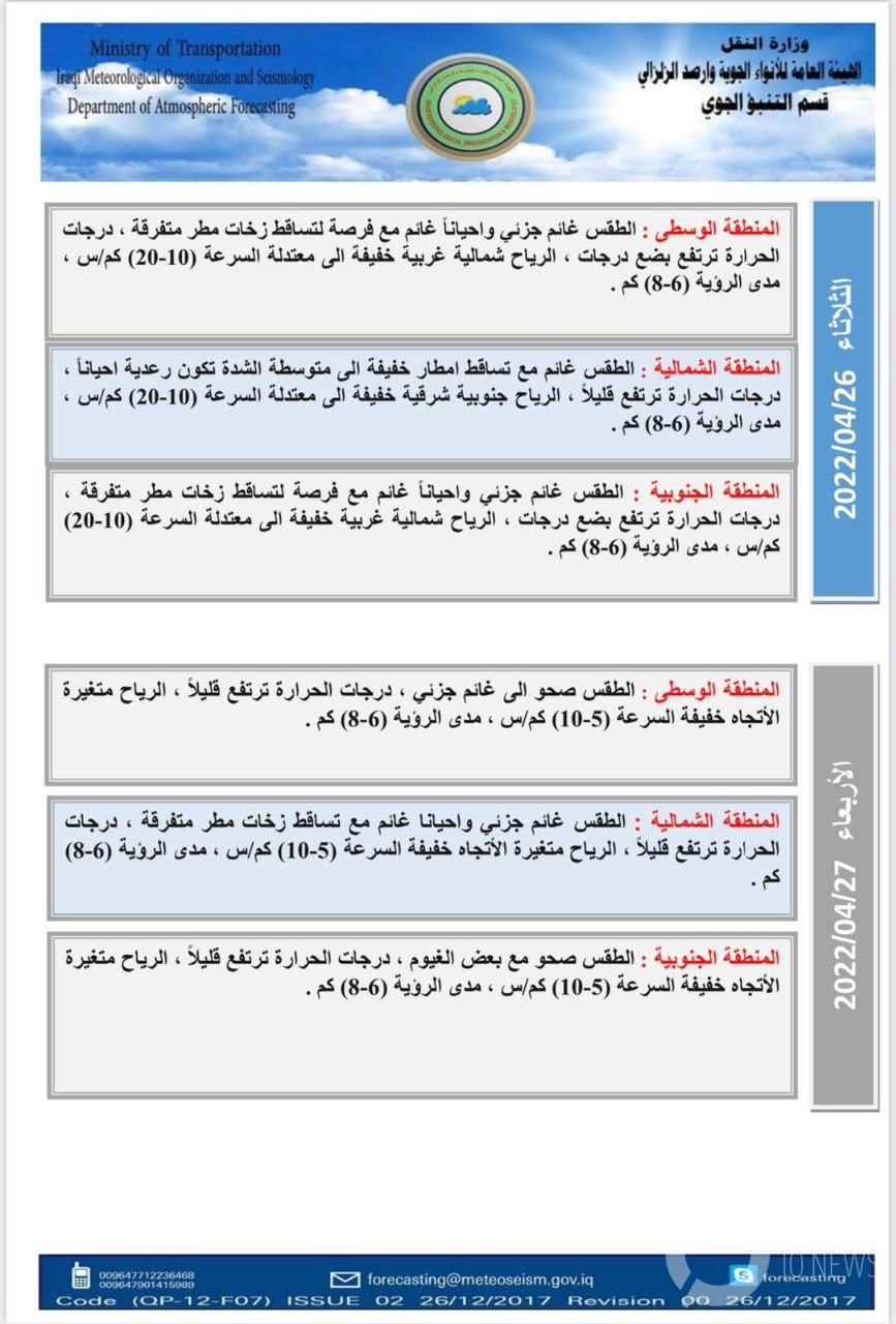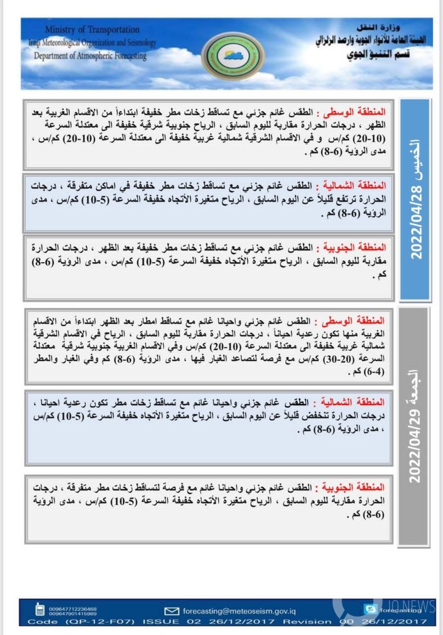 توقعت هيئة الأنواء الجوية، الإثنين، (25 نيسان، 2022)، استمرار الغيوم والأمطار بعموم البلاد في الأيام المقبلة حتى نهاية الأسبوع.