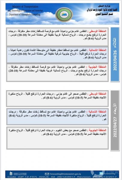 وفي ما يلي جداول بحالة الطقس اليوم والأيام الأربعة المقبلة:![]()