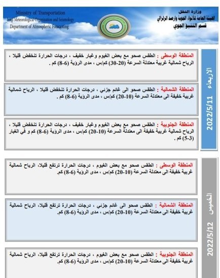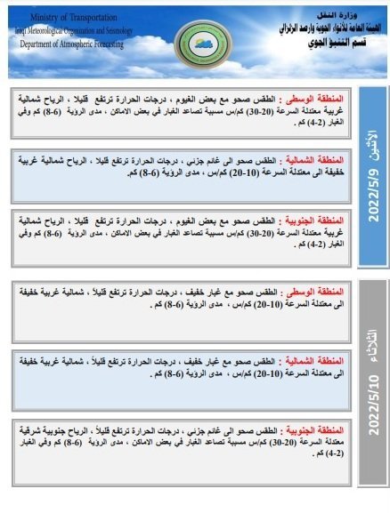 أعلنت هيئة الأنواء الجوية، اليوم الأحد، عن حالة الطقس في البلاد للأيام المقبلة، فيما توقعت ارتفاعاً في درجات الحرارة بدءاً من الغد.