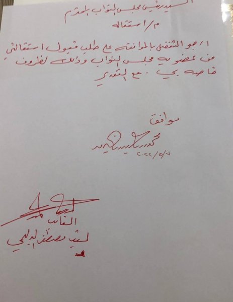وطلب الدليمي في كتاب يحمل توقيعه، وموجه إلى الحلبوسي ، قبول استقالته من عضوية البرلمان لـ"ظروف خاصة".