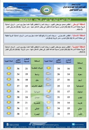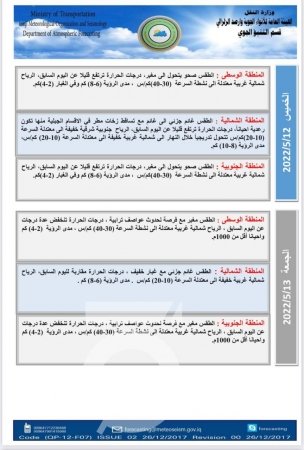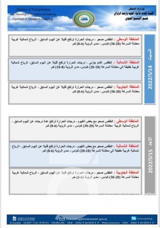 توقعت هيئة الأنواء الجوية، الأربعاء، (11 أيار، 2022)، أن تكون الأجواء مغبرة مع فرصة لحدوث عواصف ترابية خلال يومي الخميس والجمعة المقبلين، خاصة في المناطق الوسطة والجنوبية.