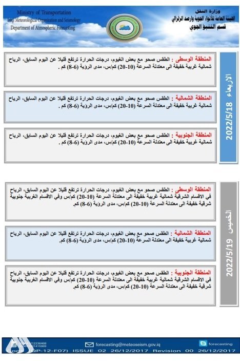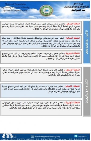 أعلنت هيئة الأنواء الجوية، اليوم الاحد، عن حالة الطقس في العراق للأسبوع الحالي، فيما توقعت ارتفاعاً في درجات الحرارة بدءاً من الثلاثاء.