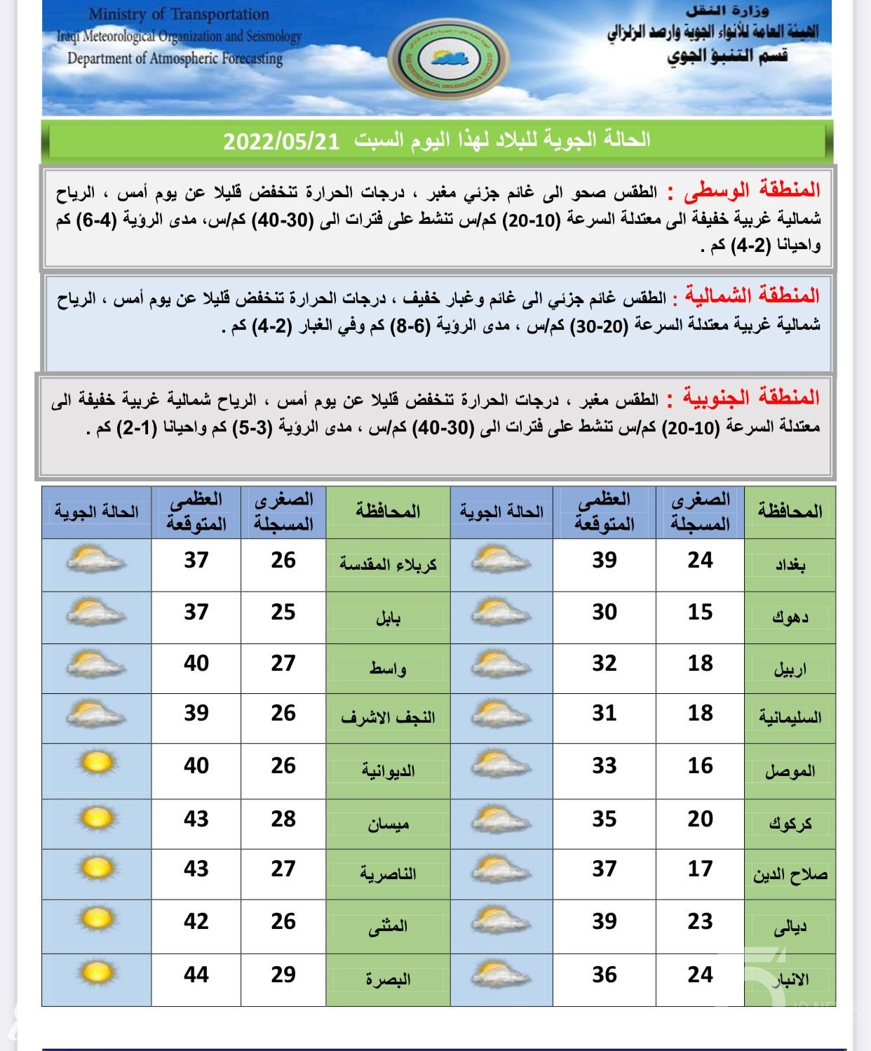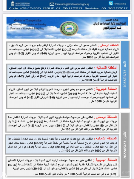 توقعت هيئة الأنواء الجوية، السبت، (21 أيار، 2022)، حدوث عاصفة ترابية شديدة مساء الاثنين المقبل، في حين أشارت إلى أن جو اليوم سيكون صحواً مع انخفاض في درجات الحرارة.