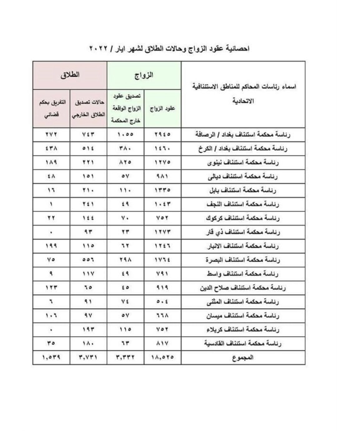 أظهرت إحصائية لشهر أيار من العام الحالي، صادرة من رئاسات المحاكم للمناطق الاستئنافية، في العراق، رقما مخيفا لحالات الطلاق في جميع محاكم البلاد. واظهرت الإحصائية ان هناك 5270 حالة طلاق، من مجموع 21857 حالة زواج. الاطلاع على نص الإحصائية: