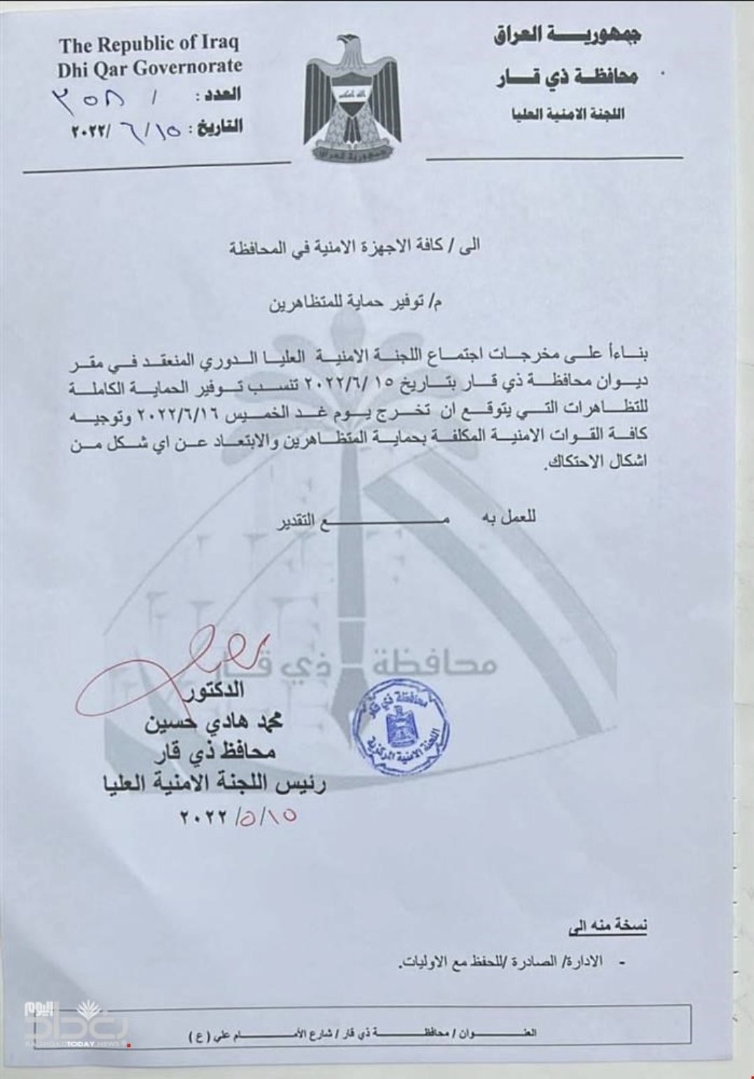 واظهرت وثيقة موقعة من قبل رئيس اللجنة محافظ ذي قار محمد هادي، يوصي من خلالها القوات الأمنية بعدم الاحتكاك مع المتظاهرين باي شكل من الاشكال.