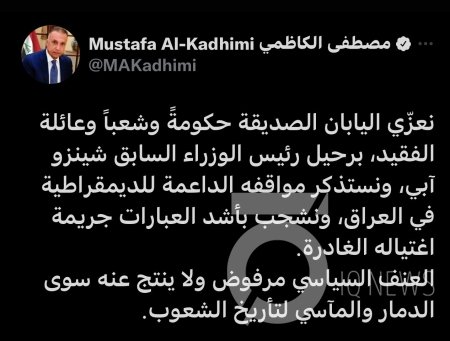 شجب رئيس مجلس الوزراء، مصطفى الكاظمي، الجمعة(8 تموز 2022)، عملية اغتيال رئيس الوزراء الياباني السابق شينزو آبي، فيما حذر من نتائج العُنف السياسي.