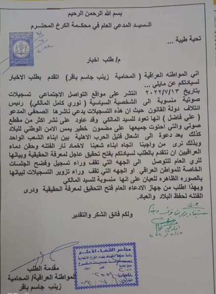 قدمت المحامية زينب جاسم باقر، اليوم الأحد، طلب إخبار إلى المدعي العام بمحكمة الكرخ في العاصمة بغداد بشأن التسجيلات المنسوبة إلى زعيم إئتلاف دولة القانون نوري المالكي. أدناه نص الطلب: