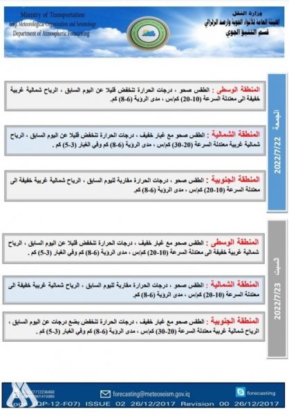 أعلنت هيئة الأنواء الجوية، اليوم الخميس، عن حالة الطقس للأيام المقبلة، فيما توقعت حدوث عواصف ترابية وانخفاض في درجات الحرارة.