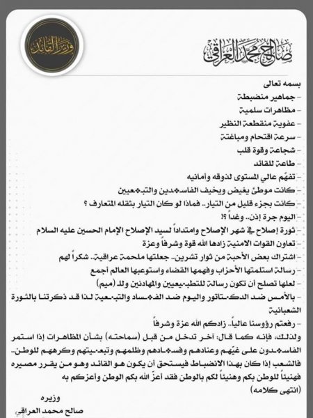 وقال الصدر في "تغريدة" له "بتويتر" "ثورة اصلاح ورفض للضيم والفساد وصلت رسالتكم وارعبتم الفاسدين".