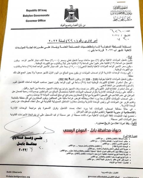 ألزم محافظ بابل اليوم الجمعة أصحاب المولدات الأهلية بحزمة تعليمات جديدة.و جاء في وثيقة صادرة عن ديوان محافظة بابل و حصلت وكالة من كربلاء الخبر على نسخة منها ما يلي: