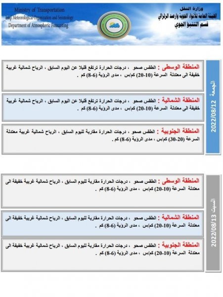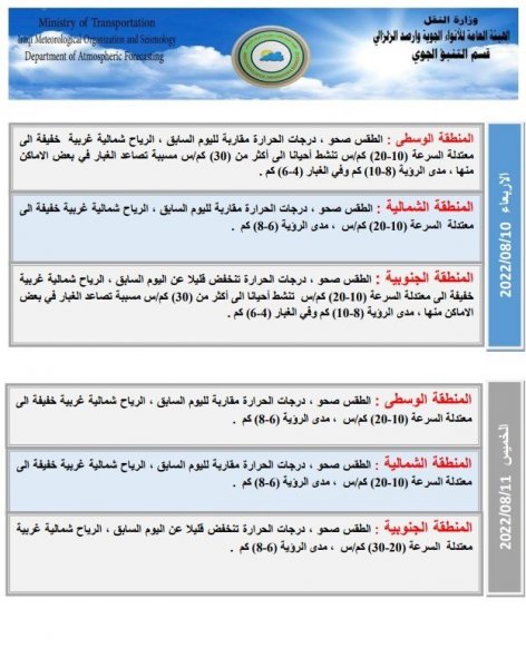 أعلنت هيئة الانواء الجوية، اليوم الثلاثاء، عن حالة الطقس في البلاد للأيام المقبلة، فيما توقعت تصاعداً للغبار وارتفاعا قليلا في درجات الحرارة.