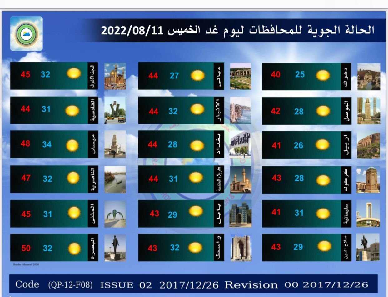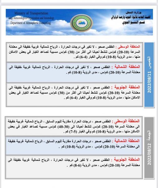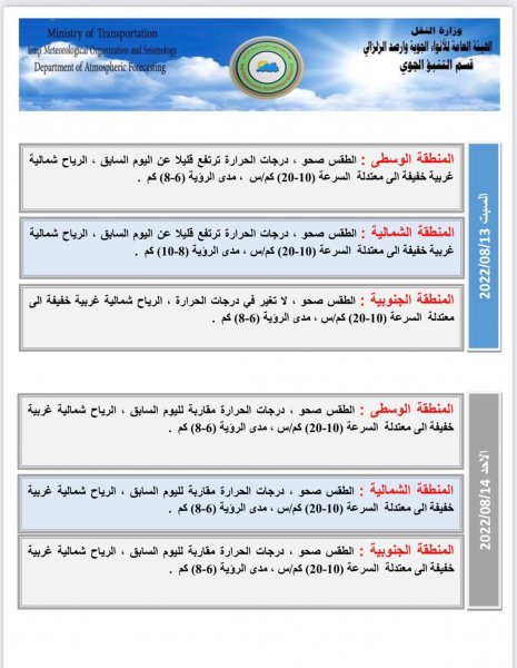 أعلنت هيئة الأنواء الجوية، اليوم الأربعاء، عن حالة الطقس في البلاد للأيام المقبلة، فيما توقعت ارتفاعاً بدرجات الحرارة بدءاً من الأسبوع المقبل.