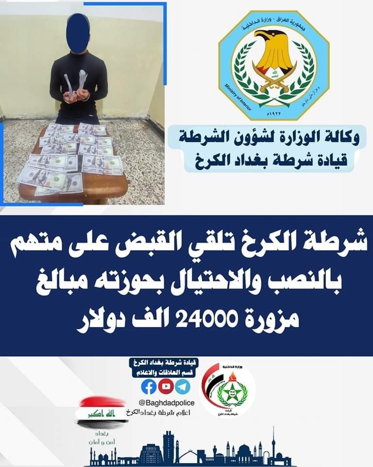 اعلنت قيادة شرطة الكرخ، اليوم الاثنين (8 كانون الثاني 2024)، القبض على متهم بالنصب والاحتيال بحوزته هويات مزورة في سيطرة ابو غريب الجديد غرب العاصمة بغداد.