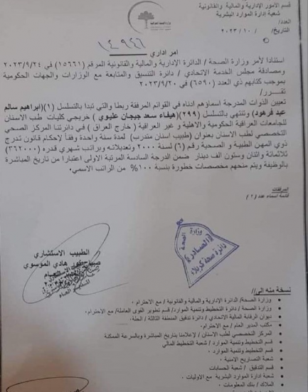 أعلنت وزارة الصحة، اليوم الأربعاء، (4 أيلول 2024)، عن مصادقة مجلس الخدمة الاتحادية على تعيين خريجي ذوي المهن الصحية.