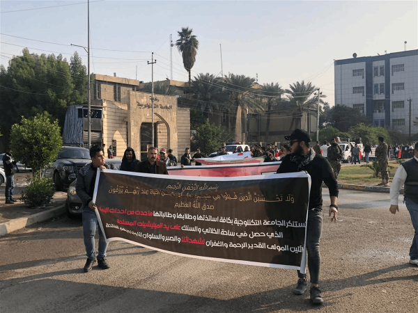 وقال مصدر أمني، ، إن "العشرات من طلبة الجامعة التكنولوجية نظموا تظاهرة، وسيتم التوجه بمسيرة إلى ساحة التحرير تنديداً باستهداف متظاهرين في منطقة السنك".