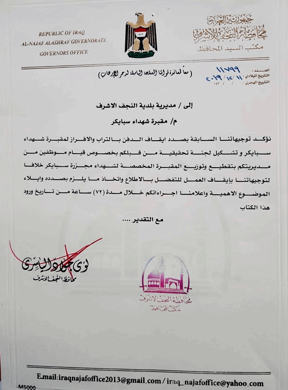 بالوثيقة.. توجيه من محافظ النجف بخصوص مقبرة "شهداء سبايكر"