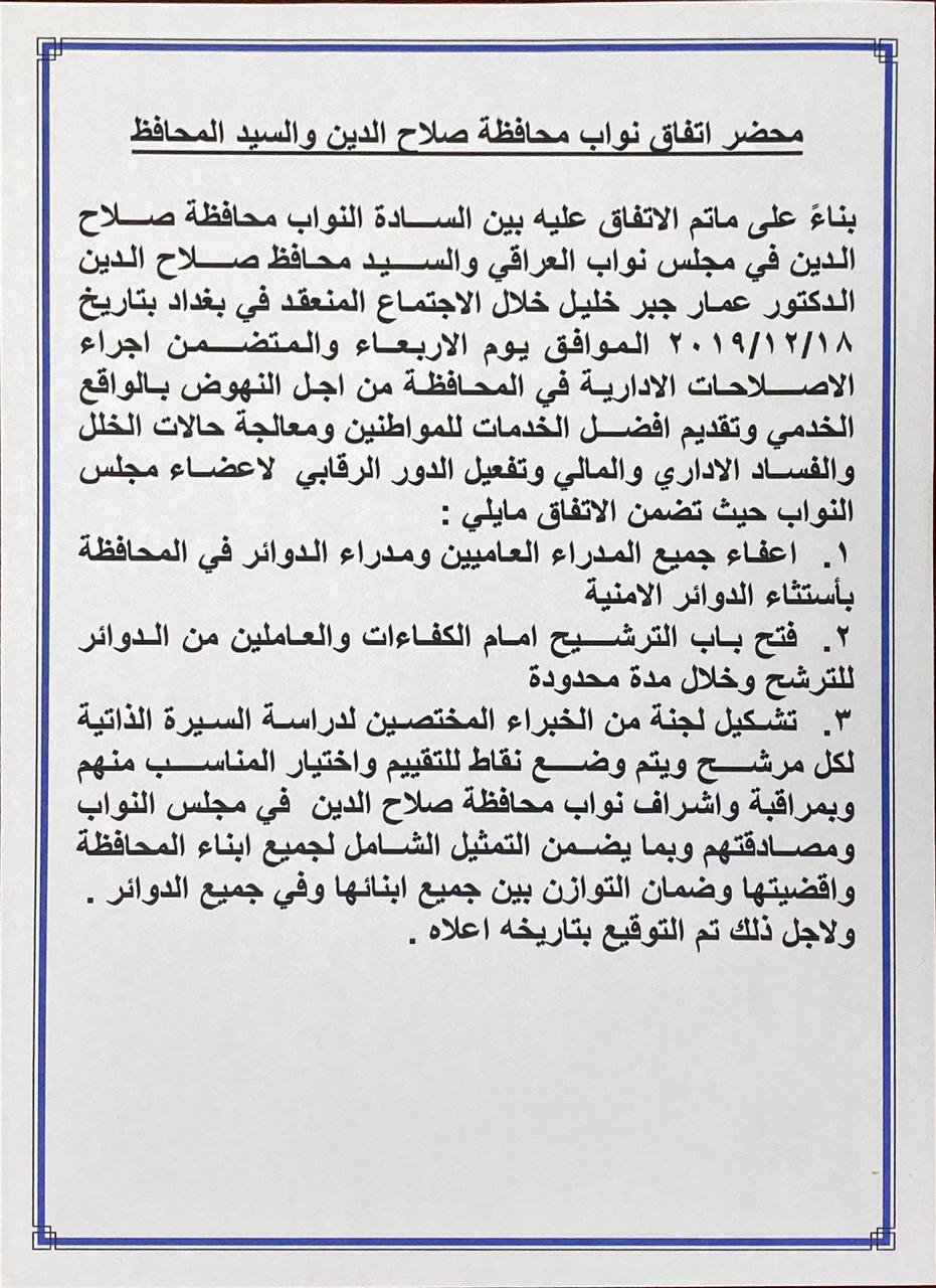 قرر نواب عن محافظة صلاح الدين، والمحافظ عمار جبر خليل، خلال اجتماع لهم اليوم الاربعاء، اعفاء المدراء العامين ومدراء الدوائر كافة من مناصبهم، باستثناء الدوائر الامنية، وفتح باب الترشيح لـ"الكفاءات" لشغل تلك المناصب.