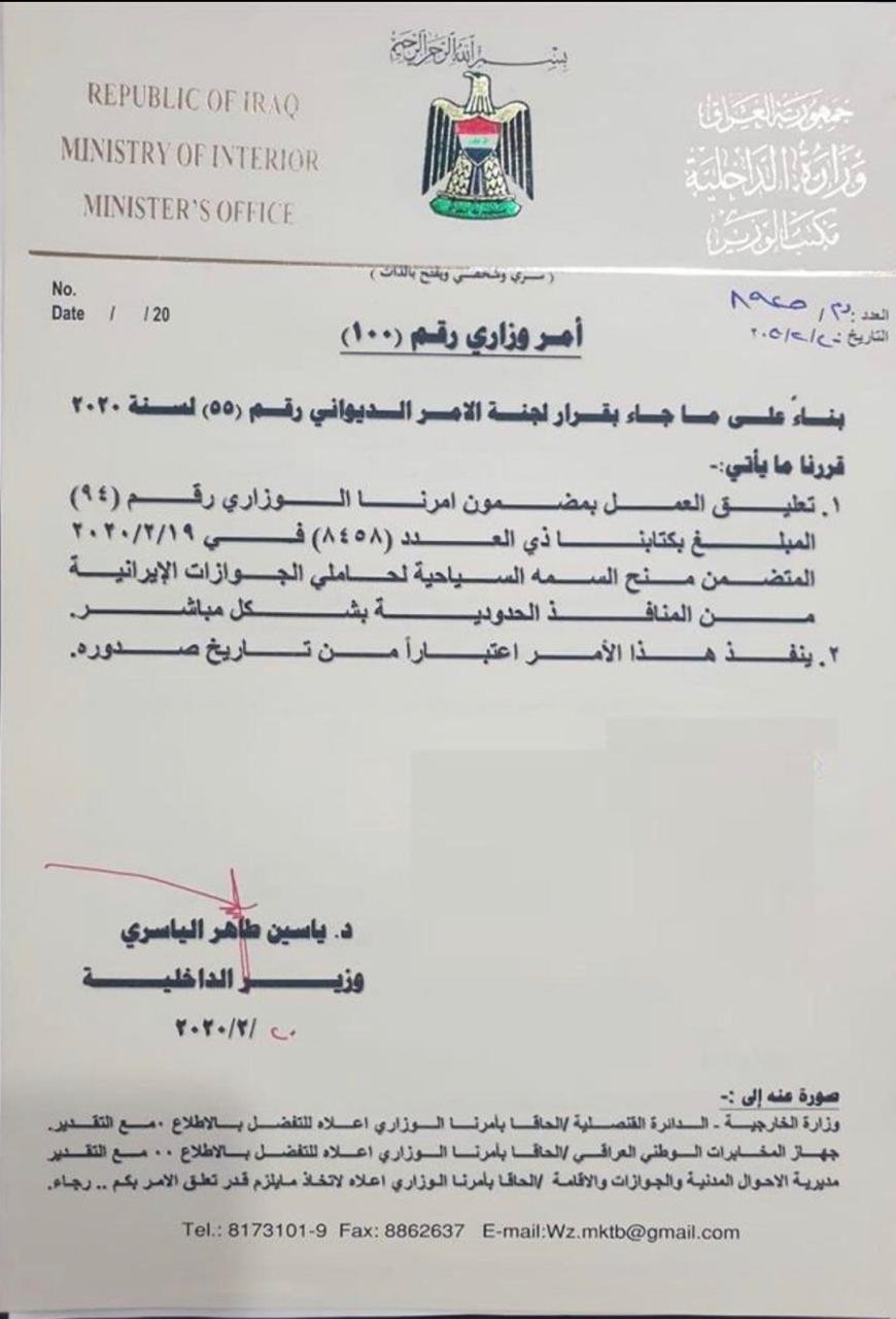 تنشر وكالة من كربلاء الخبر وثيقة صادرة من وزارة الداخلية تتضمن تعليق منح السمة السياحية لحاملي الجوازات الايرانية.
