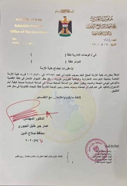 تنشر وكالة من كربلاء الخبر وثيقة باسم محافظ صلاح الدين عمار جبر الجبوري تتضمن قرارات جديدة لخلية الازمة.