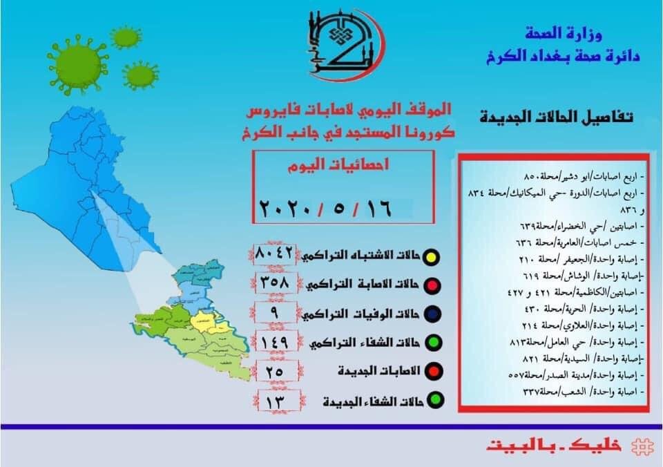 كشفت دائرة صحة بغداد الكرخ، السبت، تفاصيل الاصابات الجديدة بفايروس كورونا.