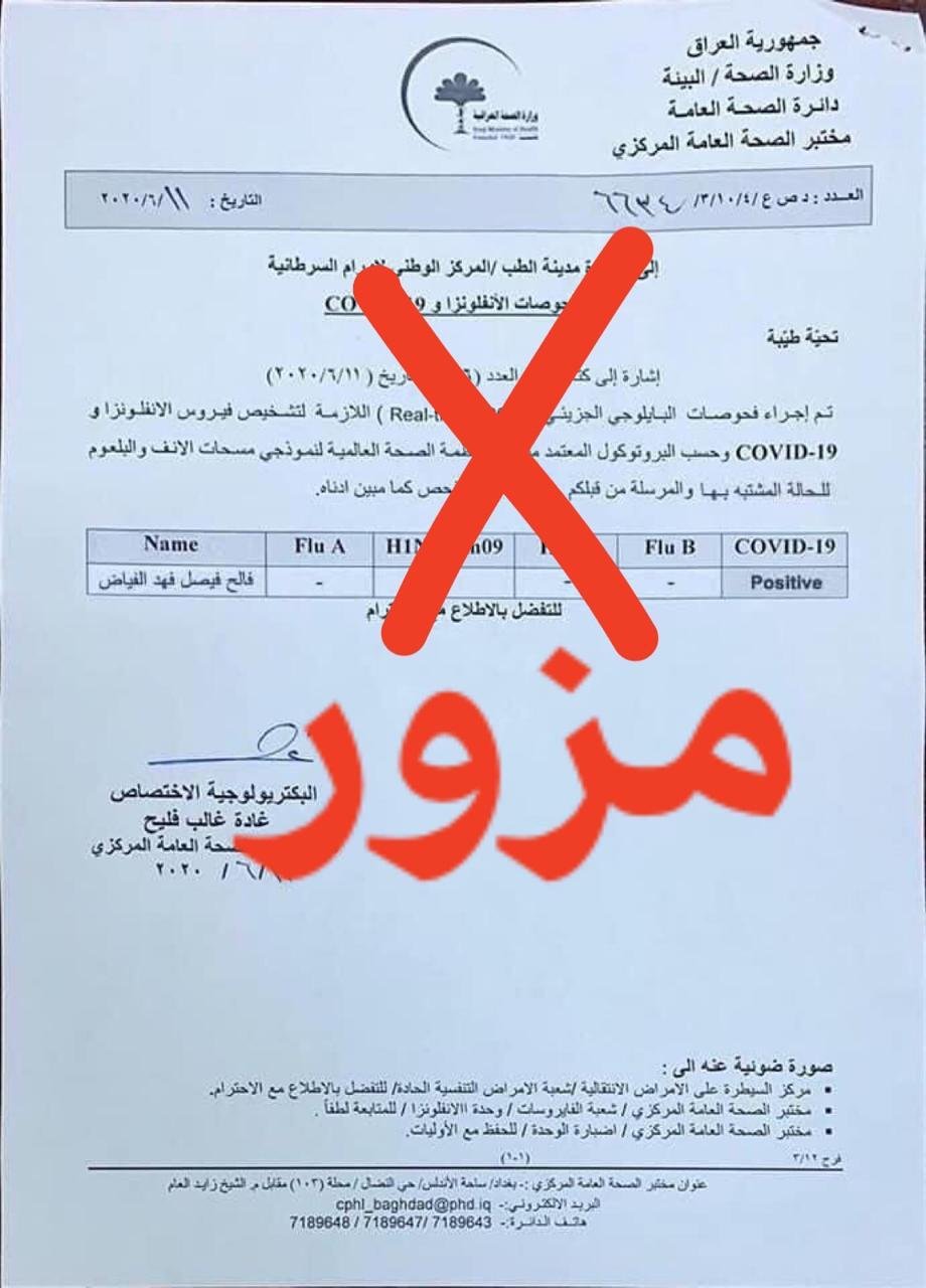 وقالت الوزارة في بيان ، إنها "تنفي ما تم نشره من كتاب مزور على انه صادر عن مختبر الصحة العامة المركزي والخاص بتشخيص فايروس كورونا باسم طيف سامي محمد السعيدي"، مؤكدةً أن "هذا الكتاب مزور".