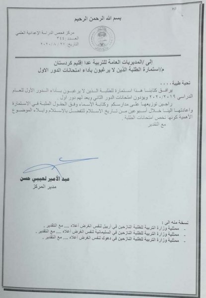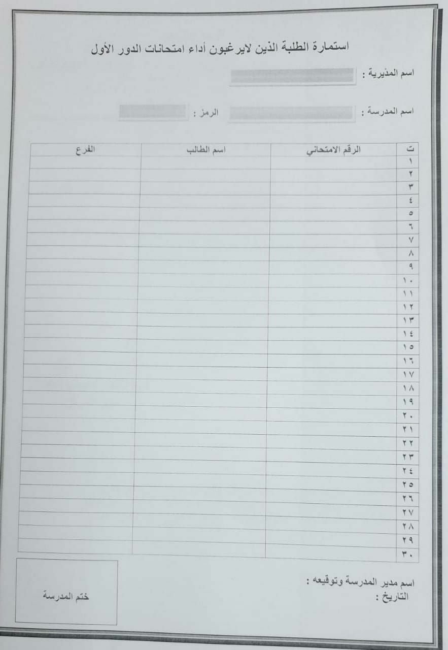 التربية تخصص استمارة للطلبة غير الراغبين بإداء امتحانات الدور الأول للدراسة الاعدادية