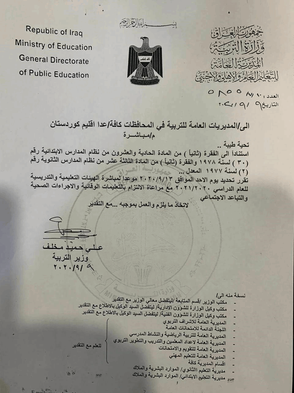 حددت وزارة التربية، الـ13 من شهر أيلول الحالي موعداً لمباشرة الهيئات التعليمية والتدريسية للعام الدراسي 2020 – 2021.