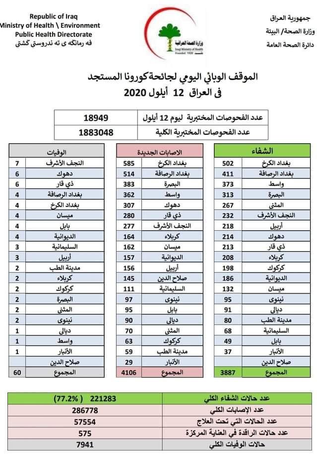 أعلنت وزارة الصحة والبيئة العراقية، اليوم السبت، تسجيل 4106 إصابات و60 وفاة جديدة بفيروس كورونا خلال الـ24 ساعة الماضية.