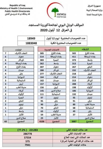 ومنذ ظهور الجائحة بلغت الإصابات في العراق 286778 إصابة، بينما الوفيات فبلغت 7941 وفاة.