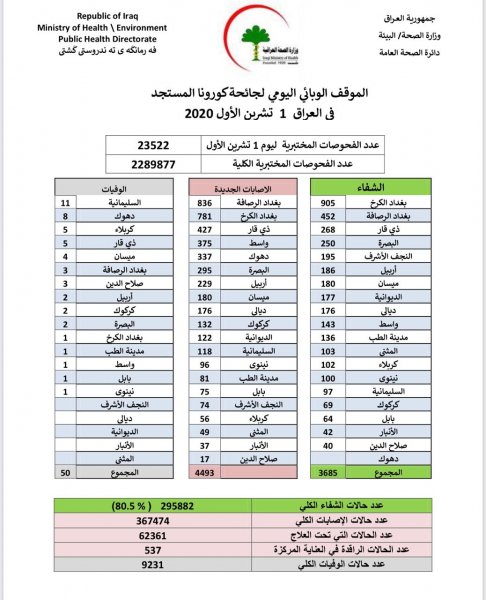 اعلنت وزارة الصحة، الخميس، عن تسجيل 4493 إصابة جديدة بكورونا وشفاء 3685 شخصاً من الفيروس.