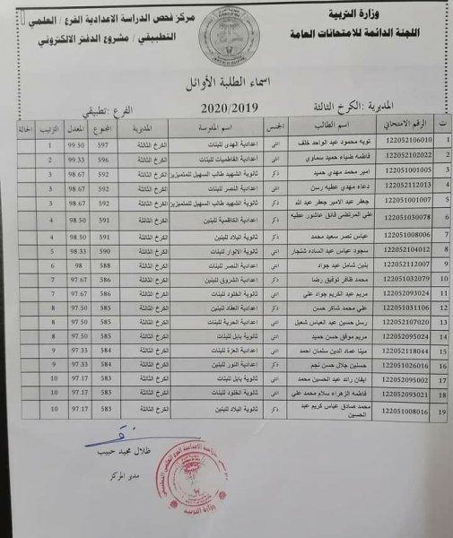 أعلنت وزارة التربية، الأربعاء (7 تشرن الأول 2020)، أسماء الطلبة الأوائل لمديرية تربية الكرخ الأولى.وحصلت على وثائق تضمنت أسماء الطلبة الأوائل بعد إعلان نتائج امتحانات السادس الإعدادي بفرعيه العلمي والأدبي.