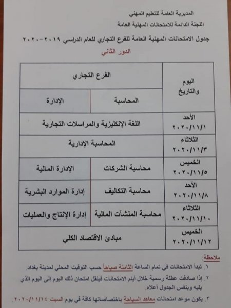 وقالت وزارة التربية في بيان لها، "جدول الامتحانات العامة / الدور الثاني للتعليم المهني ولكافة الفروع والتخصصات ( الصناعي، التجاري، الفنون التطبيقية، الزراعي، فرع الحسوب وتقنية المعلومات ، التمريض ) للعام الدراسي 2019-2020 .".