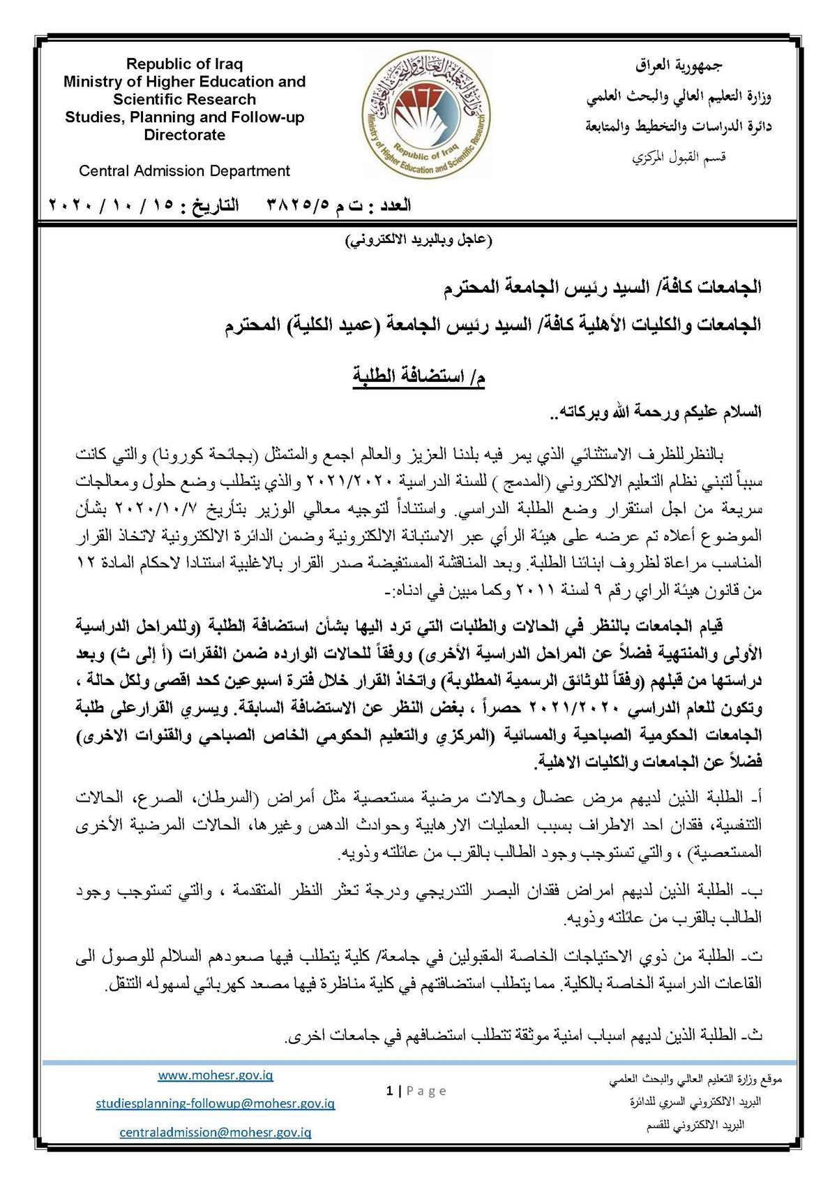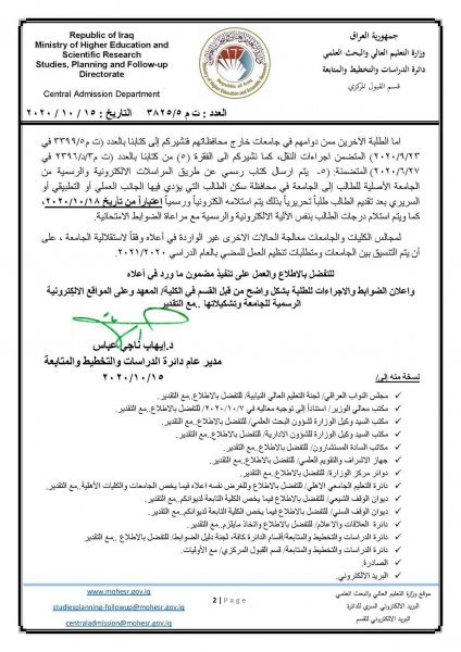 أصدرت وزراة التعليم العالي والبحث العلمي، السبت، توجيها للجامعات العراقية بالنظر في طلبات وحالات استضافة الطلبة للعام الدراسي 2021/2020.