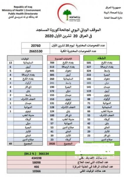 وزارة الصحة تسجل 3920 إصابة جديدة بفيروس كورونا