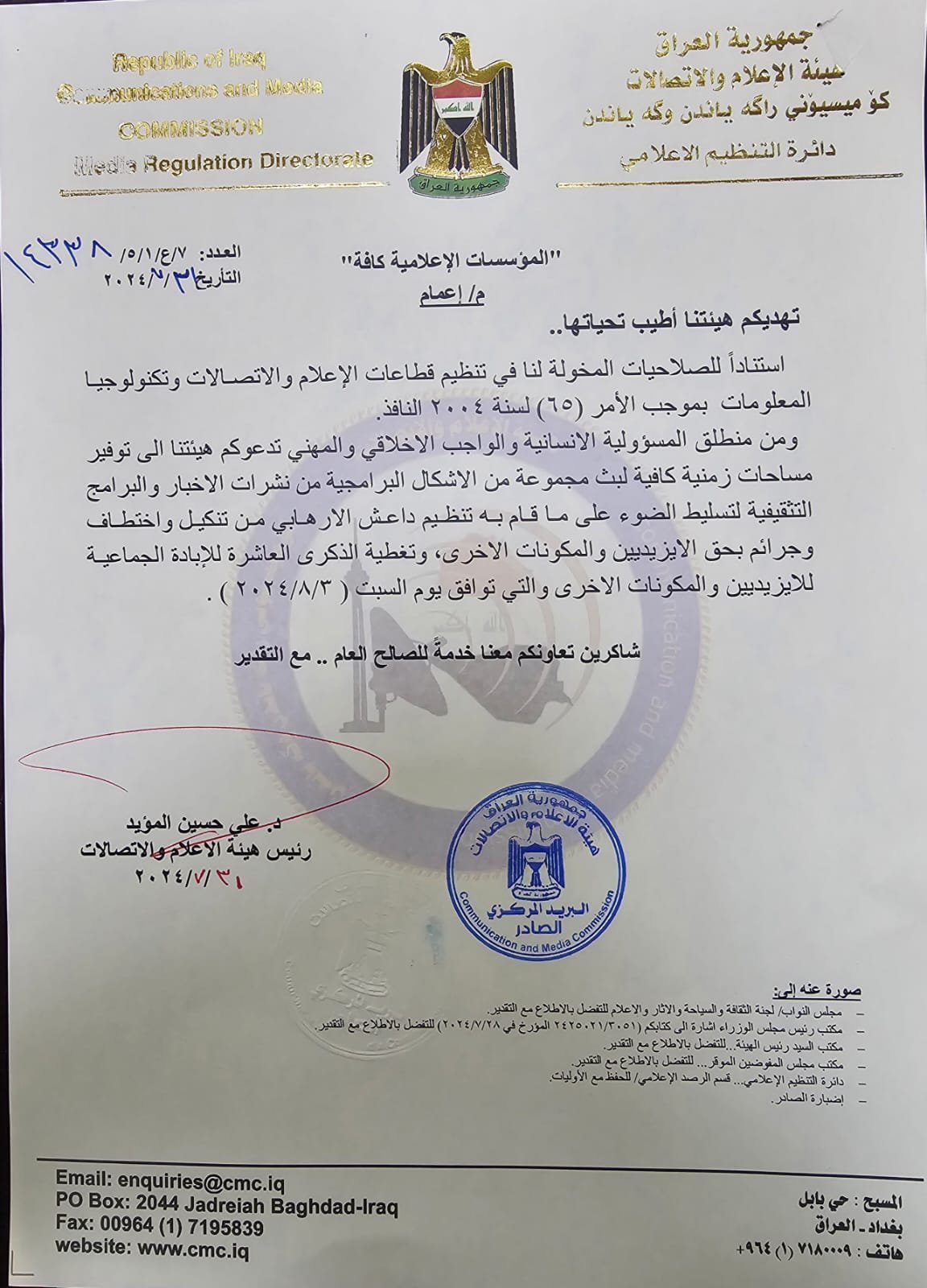 بالوثيقة.. الإعلام والاتصالات تصدر تعميماً جديداً للمؤسسات الإعلامية يخص الإيزيديين والمكونات