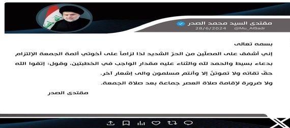 الصدر يدعو أئمة الجمعة إلى الإيجاز مع ارتفاع درجات الحرارة