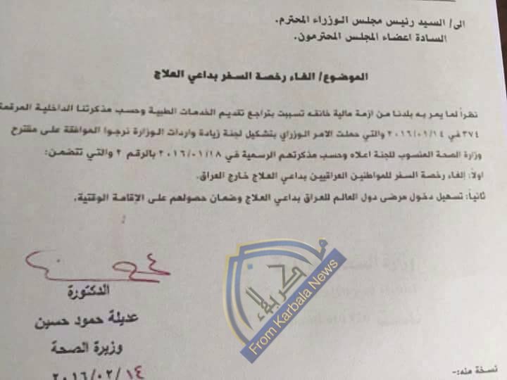 وزيرة الصحة تطالب مجلس الوزراء بإلغاء علاج المرضى خارج العراق