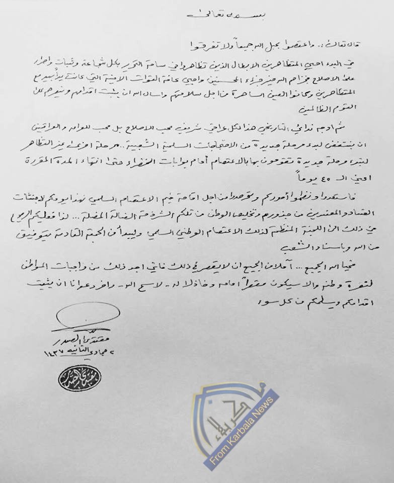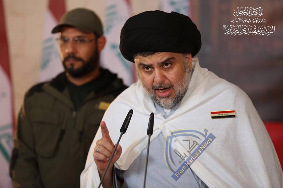 السيد مقتدى يدعو للانتفاض السلمي لاجتثاث المفسدين وتخليص الوطن من الشرذمة الضالة المضلة من خلال الاعتصام امام بوابات الخضراء