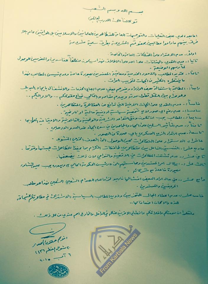 الصدر يصدر توجيهات للمتظاهرين المطالبين بحقوقهم المشروعة