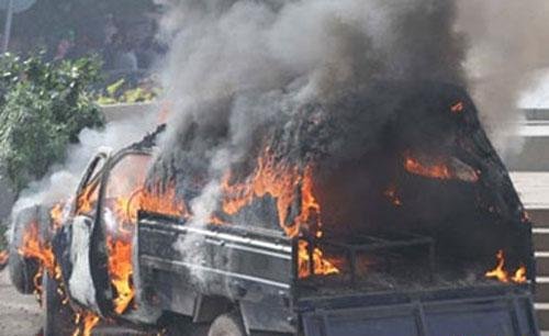 اللواء المدرع 34 يحرق عجلة لداعش تحمل صواريخ كاتيوشا في تكريت
