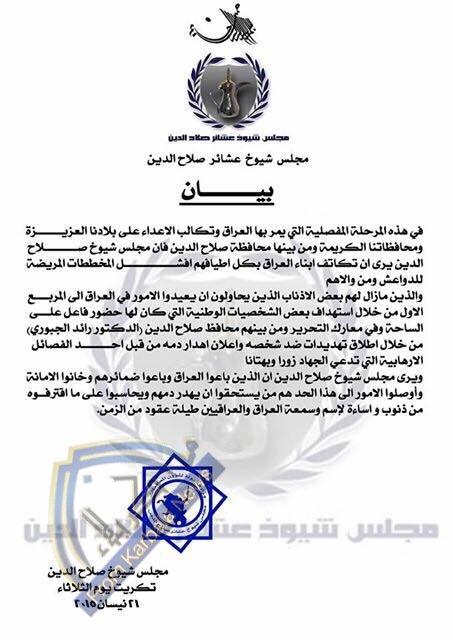 عشائر صلاح الدين تستنكر التهديدات اطلقتها العصابات الاجرامية بحق محافظ صلاح الدين