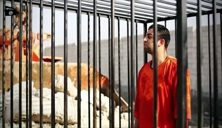 ارهابيو داعش يعرضون مقطع حرق الكساسبة بشاشات في شوارع الموصل