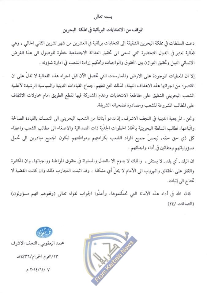 المرجع اليعقوبي يدعو السلطات البحرينية الى اتخاذ الخطوات الجدّية لحلّ مشاكل البلاد